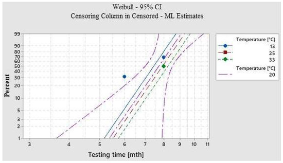 Figure 2 and Table 3 show the failure probability plot at three different temperatures and RH conditions during the 60-day test, as well as the predicted failure time under normal temperature and RH conditions.