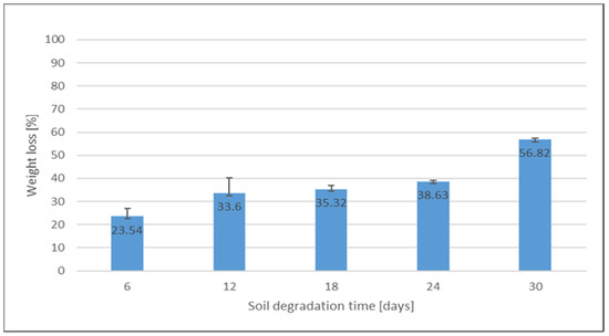 As expected, significant mass loss was observed, which increased with the duration of burial in the soil. After the 30-day burial test, the CSH films showed a weight loss of 56.82%, which is in agreement with the results of the study by Lucchese et al. [2] and the requirements of the European standard EN13432 [45] (biodegradable plastics must lose 90% of their mass after at least six months and decompose into water, CO2 and biomass). As only small CSH film samples were investigated, the obtained results should be considered estimates.