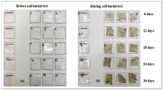 Changes in the physical appearance of the CSH film samples due to biodegradation during the soil burial test were monitored and observed by photographing the samples. The photographs of the CSH film samples before and after the biodegradation test are shown in Figure 5.