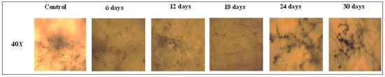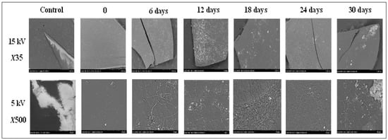 The microscopic images of the CSH film samples and control sample (Polyethylene film), recorded during the soil burial test, are presented in Figure 6.
