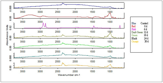 Using the FTIR spectrum of the CSH film samples during the soil burial test, the changes in molecular structures were investigated. The fingerprint area and characteristic bands of the CSH film and control samples were recorded before and during the soil burial test. Figure 8 shows the FTIR spectra of the CSH film samples during different degradation phases compared to the control sample.