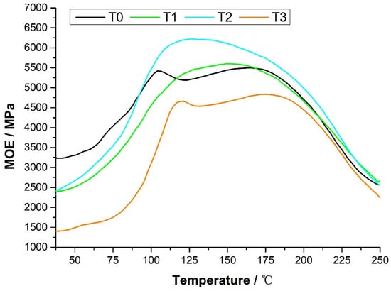 After reaching the maximum value, the MOE of the adhesives T0, T1, T2, and T3 all decreased, this being due to the thermal degradation process of the adhesive.