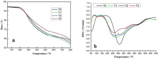 TG curves (a) and DTG (b) of T0, T1, T2, and T3 resins in the 50–650 °C temperature range.
