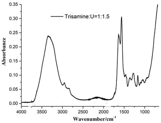 A FTIR/NIR spectrometer with attenuated total reflection (ATR) (ATR cell on a Perkin Elmer Spectrum 2000, Perkin Elmer France, Villebon-sur-Yvette, France) was used to analyze the chemical structure of the melamine–dialdehyde starch resin. The FTIR spectra consisted of 32 scans collected per run with a spectral resolution of 4 cm−1 at room temperature in the 4000–650 cm−1 range; each sample was tested 10 times.