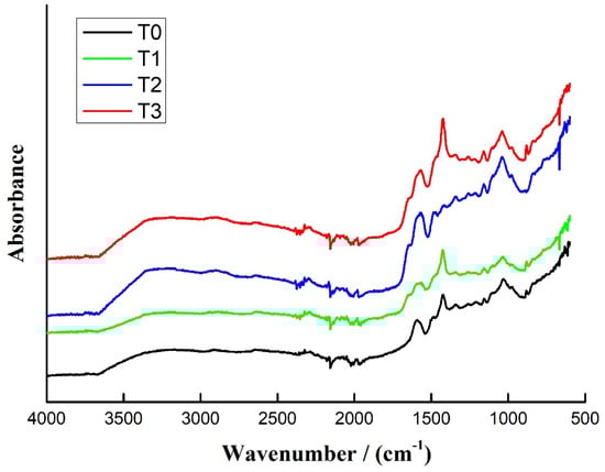 The FTIR spectra of T0, T1, T2, and T3 are shown in Figure 5. It can be seen from the figure that these spectra have a broad peak at 3405–3113 cm−1, which is the characteristic peak of hydroxyl (-OH) [], secondary amides, -NH- stretching, etc. The small peak near 2914 cm−1 is caused by the aromatic C-H stretching vibration []. The absorption peak near 1686 cm−1 is assigned to the C=O of amides [] and the peak at 1604 cm−1 to the tertiary amine group -N= of the triamine. The absorption peak at 1352 cm−1 belongs to the -NH2 of the amine; the absorption peak at 1262 cm−1 is the amine C-N elongation []. Not much can be gleaned from just the FTIR of the four resins.