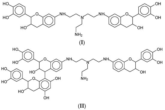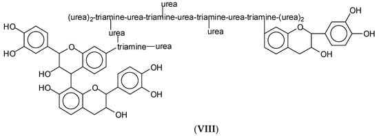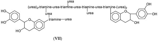 Of interest here is instead the reaction of a condensed flavonoid tannin with the oligomers of the hyperbranched tris(2-aminoethyl)amine-urea to form a workable wood panel adhesive without the use of any aldehyde. Several interesting species are formed (Figure S2 and Table S2, Supplementary Materials). Among these, some explain how the amine network interacts with the phenolic tannin, such as the structure at 1666 Da (Figure S2, Supplementary Materials) in which two flavonoid monomers are linked to a hyperbranched tris(2-aminoethyl)amine-urea oligomer (structure VII) (Figure 9).