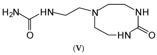 Of the two cyclic reaction products cited by other authors [] for the reaction of tris(2-aminoethyl)amine-urea, only the one at 216 Da has been observed in minor amounts (Figures S1 and S2, Tables S1 and S2, Supplementary Materials) (Figure 7) (V).