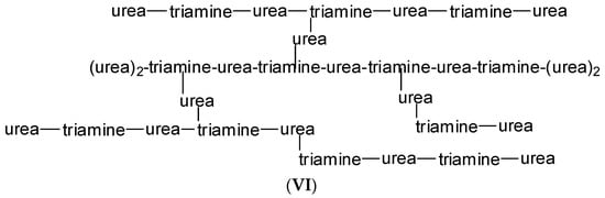 The MALDI ToF investigation of the first part of this reaction has shown the progressive reaction of urea and tris (2-aminoethyl) amine proceeding from small oligomer species to more complex structures. The MALDI ToF spectra and the list of the species identified are shown in Figure S1 and Table S1 in the Supplementary Materials. Here, it is sufficient to indicate the complex structures up to a molecular weight of 2456 Da; these have been identified as structure (VI) (Figure 8).