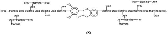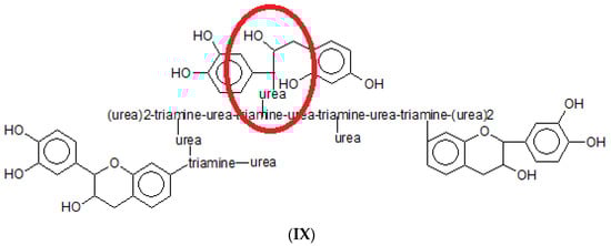 Urea is known to react with tannin but only on the opening of the heterocyclic flavonoid C-ring to stop tannin self-condensation [], but not in general for substituting with an -NH- group the phenolic -OHs of flavonoids. This is so because the reactivity of the amide -CONH2 group is too low due to its far too low alkalinity for an acid–base reaction to occur with the mildly acidic phenolic -OHs. In tannin oligomers, it often occurs that there are a few flavonoid units where the C-ring has opened; some condensation with some urea terminal units of the triamine–urea hyperbranched structure can occur []. It is interesting to see by MALDI ToF that effectively a very limited amount of these primary amide groups are able to react with the tannin. This latter substitution reaction is not common, as over the full range of 3000 Da of the MALDI analysis, only one structure was found where the phenolic -OH of a flavonoid was substituted by the amide group of a terminal urea. Structure IX in Figure 11 is the one in question.