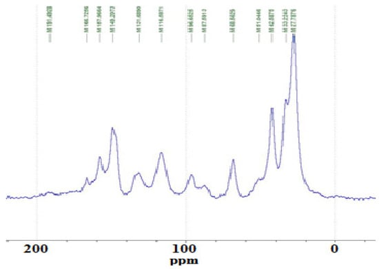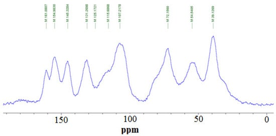 Second, mimosa tannin extract was reacted with the tris(2-aminoethyl)amine-urea hyperbranched polymer at 100 °C in an oven, and solid-state CP-MAS (cross-polarisation/magic-angle spinning) 13C NMR spectra were obtained on a Brüker MSL 300 spectrometer (Brüker France, Wissembourg, France) using the solids obtained by drying. The frequency used was 75.47 MHz. Tetramethyl silane (TMS) was used as the base for calculating the spectra chemical shifts. The conditions used were 4 kHz rotor spinning on a double-bearing 7 mm Bruker probe, 5 s recycle delays, a 90° pulse of 5 s; and a contact time of 1 ms for 3000 transients.