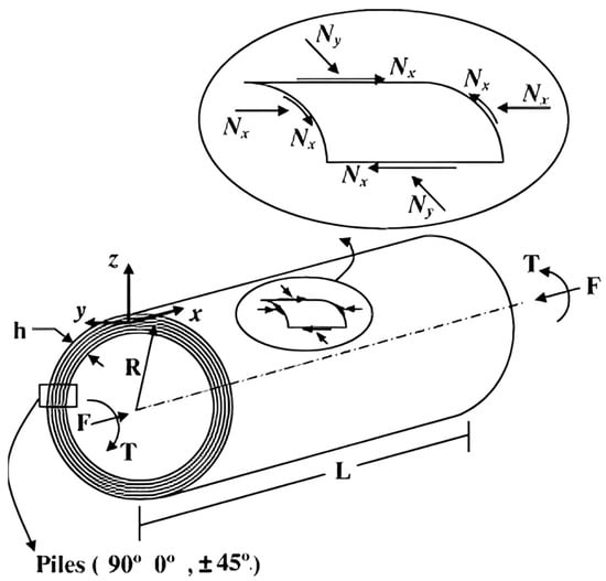 For the carbon-fiber-reinforced composite cylindrical skirt of length L, radius R, and thickness h, shown in Figure 1, under axial compression F and aerodynamic torque T, the effects of aerodynamic torque can be neglected, as demonstrated by Liang and Cheng [20]. The composite laminate, adopted for the skirt, was chosen to be symmetric and balanced with respect to its mid-surface with the basic eight plies of quasi-isotropic building blocks characterized by the stacking sequence [90/0/45/−45]s (the fiber orientations of the plies being defined as the angles between the fiber direction and the load axis). The resultant force applied to the carbon-fiber-reinforced cylindrical skirt is:
