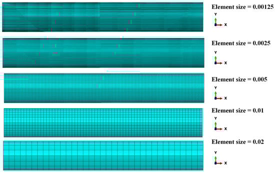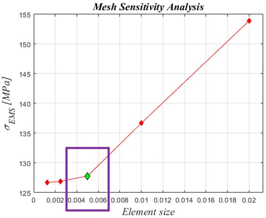 Mesh sensitivity analysis (ES expressed in (mm))—maximum equivalent von Mises stress. Chosen ES, 0.005 mm (in green).