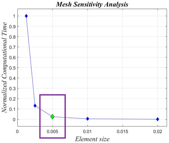 Mesh sensitivity analysis (ES expressed in (mm))—normalized computational times. Chosen ES, 0.005 mm (in green).