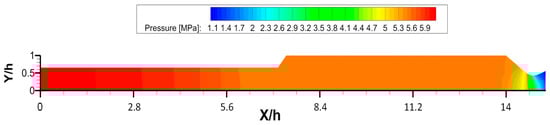 From the surface of the burning grain, in the solid rocket motor ONERA C1xb, there is a mass flow injected into the chamber constantly accelerated toward the nozzle, where supersonic conditions are reached. Considering the regression rate, a firing time of s, which matches 3 mm of the layer of grain burned, is considered enough to guarantee a uniformly distributed pressure in the chamber. Due to the axisymmetric RANS approach, just an average mean flowfield can be displayed, which means that the inhomogeneity of the mass injection, the hydrodynamic instabilities, and the vortex shedding phenomena were not considered. Indeed, these effects were not considered of interest for the test case under consideration because they are related to non-symmetrical, non-stochastic, unpredictable, and unsteady blows in the solid rocket motor, which were not considered relevant for the period T under investigation. The output pressure found from the CFD analysis in the chamber is , as shown in Figure 8. The simulations to assess the mechanical behaviors of the skirts were carried out in Abaqus by applying the pressure load all over the part of the skirt not coated with grain. Subsequently, a comparison between the steel ASTM-36 and carbon-fiber-reinforced skirt was carried out.