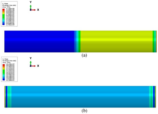 Von Mises stress (Pa) on steel skirt under pressure load (a) and thrust load (b).