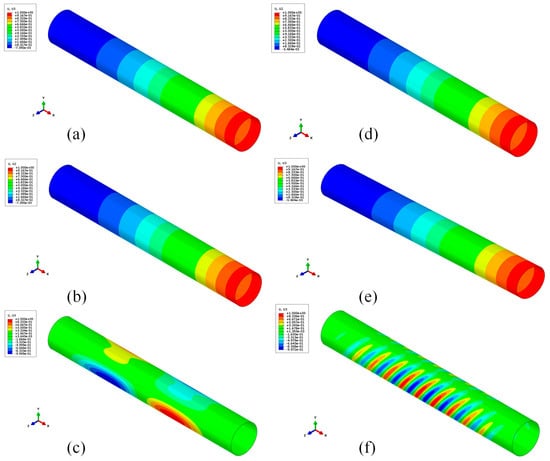 Steel configuration: Mode 1 (a), Mode 2 (b), Mode 3 (c). CFRP configuration: Mode 1 (d), Mode 2 (e), Mode 3 (f).