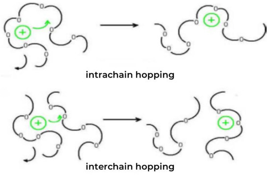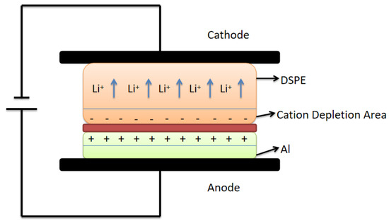 On the basis of the anodic bonding of (PEG)10LiClO4 and Al, Li+ occurring in DSPEs (Dry Solid Polymer Electrolytes) mainly exists in the ionic state [26,27]. During the complexation reaction with PEG, Li+ can be dispersed and embedded in the molecular chain of PEG in accordance with certain rules for complexation. At room temperature, owing to the influence of Coulomb force and intermolecular force inside the material, the free movement of Li+ is inhibited, and the material exhibits low ionic conductivity. When ambient temperature increases, the thermal motion of the molecules inside DSPE increases, and the energy increases [28,29,30]. When the energy of Li+ increases to a certain level, it eliminates the shackles of the surrounding Coulomb force and intermolecular force and then forms a decomplexed state. Li+ moves from its original position to another adjacent vacancy, and then moves directionally within the material under an external electric field (Figure 1) [31,32,33,34,35].