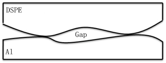 In Figure 6, we assume that neither shear force at the well-contacted bonding interface (|| > a) nor displacement in the y-axis exists. The maximum deformation of the gap should be at the origin of the coordinates. We also assume that the elastic modulus of the aluminum foil is , the Poisson’s ratio is vAl, and the pressure on the upper and lower surfaces of the interface gap is P. The deformation of the aluminum foil in the y-axis direction at the gap is thus defined as