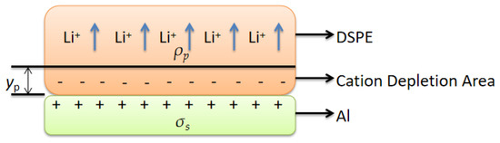 To facilitate the assessment of the effect of the bonding current on the internal field strength of the cation depletion area, we assume that the cations can be precipitated after migrating to the cathode, and the oxygen anions in the cation depletion area are uniformly distributed. We further assume that the thickness of the cation depletion area is yp, the charge density is ρp, the dielectric constant is εp, and the surface charge density of the aluminum foil is σs (Figure 7).