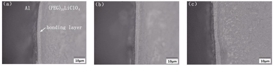 Figure 10 is the SEM (Scanning Electron Microscope) image of the anodic bonding interface of (PEG)10LiClO4 and Al at different bonding voltages. It can be seen that each interface has an obvious bonding layer between (PEG)10LiClO4 and Al and there are no obvious pores and cracks at the interface. However, it can be observed that the thickness of the bonding layer increases with the increase in bonding voltage.