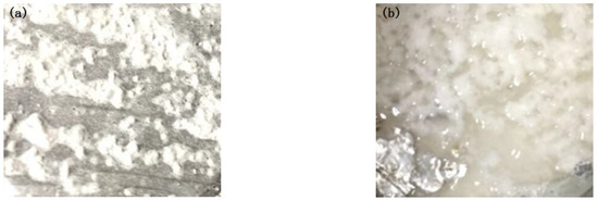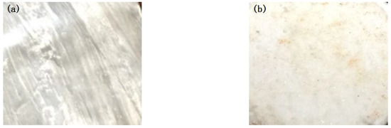In Figure 13, there significant residue can be seen on one side of the aluminum foil, as well as some pits and a small amount of aluminum foil residue on the polymer side. This shows that part of the tensile fracture of the interface occurred in the bonding base metal and the bonding strength was high at this time (1.3 MPa).