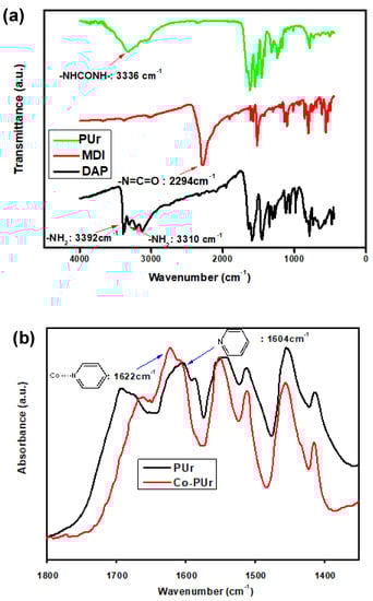 ), which contributes to a stretch band at ca. 1604 cm−1 in the IR spectrum of uncomplex, neat PUr, as seen in Figure 2b. After chelating with Co(II) (Co-PUr), the peak splits into two peaks at 1622 and 1604 cm−1 (demonstrating a shoulder form) following Figure 1b [39]. In other words, introducing the pyridine group into the polymer backbone can effectively increase the number of complexed Co(II).