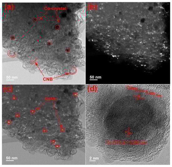 The presence of the CoNx centers can be revealed by comparing the micropictures taken in the bright and dark fields of HR-TEM as seen in Figure 3a,b, respectively. In the bright-field picture (Figure 3a), the giant Co crystals are randomly distributed in the carbon matrix, which is full of carbon nanobelts (CNBs) or carbon nanorings (CNRs). Obviously, the Co atoms behave as the seeds to grow CNB or CNR during high-temperature calcination. The nanobelt or nanoring grows by adding each carbon shell one on one, starting from the crystallized Co seeds [39,40,41,42,43]. However, there is no evidence of the existence of the CoNx center in the bright-field picture demonstrated in Figure 3a. Considering the capability to reflect electrons for metal, a picture taken in the dark field is used to illustrate the shining dots of the Co-active centers, as shown in Figure 3b. Many tiny shining spots in the Co–N–C matrix (CoNC-900A800) reveal the formation of many CoNx centers after calcination. To clearly locate the position of the CoNx centers, we eclipse the bright and dark pictures in Figure 3c, which showed that most of the CoNx centers are not located within CNBs or CNRs but stay out of them. This indicates that CNB and CNR did not originate from CoNx centers but from the Co crystals. The large dark particles in Figure 3c are the crystallized Co elements created beneath the carbon matrix during calcination. The HR-TEM picture of one of the particles is illustrated in Figure 3d, demonstrating the clear Co(111) plane with a d-spacing of 0.205 nm (2θ = 44°) inside the particle. Furthermore, on the brink and surrounding area of the particle, we can observe the C(002) plane of the carbon matrix, and the d-spacing is ca. 0.356 nm, which can be obtained from the diffraction peak at 25° (2θ) illustrated in the XRD section.