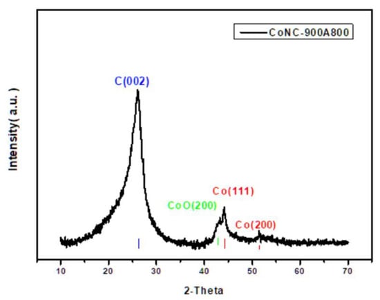 CoNC-900A800 was chosen to analyze the ordered crystalline structure of CoNCs by XRD patterns. The pattern displayed a significant peak at about 25° related to the C(002) plane, as seen in Figure 4 for CoNC-900A800. The remaining peaks exhibited smaller intensities at 2θ = 43°, 44°, and 51.5°, corresponding to the CoO(200), Co(111), and Co(200) planes of crystallized cobalt, respectively. Based on Bragg’s law, the d-spacings for the C(002) and Co(111) planes are 0.356 and 0.205 nm, respectively, matching the results obtained from the HR-TEM picture in Figure 3d. The affluent crystallized carbon composition of carbon nanobelts (CNBs) or carbon nanorings (CNRs) indicates that a highly conductive carbon matrix is ready to serve as the medium for the electrons from the anode. The unprotected Co crystals or Co oxides (CoO) can be removed by acid leaching. Therefore, the Co-crystalline formed is believed to be under the protection of the carbon matrix and is free from oxidation during acid leaching and calcination. Co crystals can explain why many CNBs and CNRs were created during calcination. As seen in the TEM pictures, the Co (or Fe) crystal acts as the seed to grow CNTs from consuming other carbon matrices [41,42,43,44,45,46].