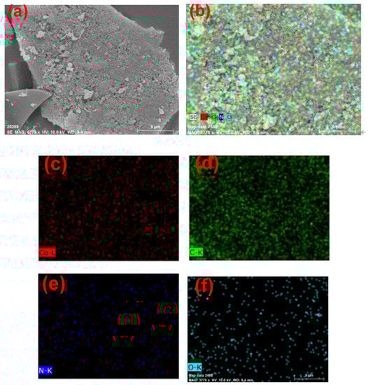 The SEM picture and EDs of CoNC-900A800 are illustrated in Figure 7a,b, respectively. The dispersions of Co, N, C, and O elements on the CoNC-900A800 surface can be observed from the mapping diagrams (Figure 7c–f), which are uniformly distributed on the catalyst surface. Table 2 shows the analysis of the compositions of all Co–N–C catalysts. The increase in the C element content indicates the increase in the degree of the catalysts, graphitization, which can improve electron conduction. High-temperature calcination can reduce the content of the oxygen element, improving the conductivity of the catalyst. The presence of nitrogen is beneficial for the Co-active site of the catalyst. However, high-temperature calcination will lose some of the N. The secondary calcination performed on the acid-leaching catalysts can increase the number of pores on the catalyst and supply more N to the catalyst surface.