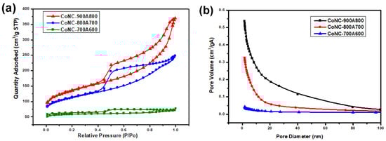 Figure 8a shows the catalysts, nitrogen adsorption and desorption curves at different calcination temperatures. Catalysts with different end-calcination temperatures belong to the type (IV) adsorption isotherm curve and the third type of hysteresis curve in the IUPAC isotherm classification. The BET surface area (BSA) of CoNC-700A600 is not high and is still below 200 m2g−1 (177.74 m2g−1). The BSA jumped more than 300 m2g−1 (369.43 m2g−1) after the treated temperature increased from 700A600 to 800A700. Eventually, the BSA was 447.81 m2g−1 for CoNC-900A800. According to Figure 8a and Table 3, high-temperature calcination can increase the specific surface area of the catalyst, expose the CoNx-active sites of the catalysts to the O2, and be more capable of carrying out the ORR.