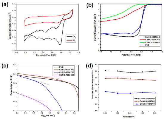 The reduction current is recorded vs. the applied voltage in Figure 9b with the rotating disk electrode (RDE) setting at various rpms, and LSV curves are obtained for various Co–N–Cs in the O2-saturated 0.1 M KOH(aq) electrolyte to study the ORR. The on-set voltage (OSV), which is related to the ORR behavior of the cathode catalyst, is only 0.78 V for CoNC-700A600. After the calcination temperature increased, the OSV becomes 0.85 and 0.88 V for CoNC-800A700 and CoNC-900A800, respectively, comparable to that of a commercial Pt/C catalyst (0.89 V), as seen in Table 4. Another property concerning the ORR is the half-wave voltage (HWV), i.e., the mid-way of the kinetic-controlled ORR. CoNC-800A700 and -700A600 demonstrate low values (0.41 and 0.39 V, respectively), compared with Pt/C (0.83 V). However, the HWV is significantly improved for CoNC-900A800 (0.82 V) and is very close to Pt/C. This indicates that a higher calcination temperature can obtain either higher OSV or HWV. The Co-PUr precursor completely degrades if it is calcined at 1000 °C, which is why the maximum calcination temperature is maintained at 900 °C.