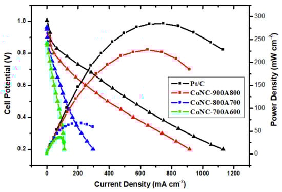 The Co–N–C based catalyst inks were prepared and coated on the cathode side of the X37-50RT membrane. An MEA was made after coating the anode side with Pt/C ink and hot-pressed. The MEA was then inserted in the cell for single-cell testing. The polarization and power density curves of the single cells with Pt/C or the Co–N–C cathode were obtained from the testing and are illustrated in Figure 10. The cell potential of both CoNC-800A700 and -700A600 decay very fast, resulting from the fast loss of ORR activity of cathode catalysts. The cell potential of CoNC-900A800 can extend to ca. 1000 mAcm−2, comparable to that of Pt/C, as seen in Figure 8. Eventually, the max. power densities (Pmax) of CoNC-800A700 and -700A600 (Table 4) are less than 100 mWcm−2 (67.0 and 35.8 mWcm−2, respectively) due to the 25% and 75% of the ORR following the 2e-pathway. The single cell with the CoNC-900A800 cathode demonstrates a relatively high Pmax of 227.7 mWcm−2 (Figure 10 and Table 5) that is comparable to that made of the Pt/C cathode (285.3 mWcm−2) and is higher than that of the common Co–N–C-based AEMFC that used only Pt/C as the anode [47,48,49,50,51,52,53] instead of using expensive Pt-Ru/C as the anode [47,54,55].