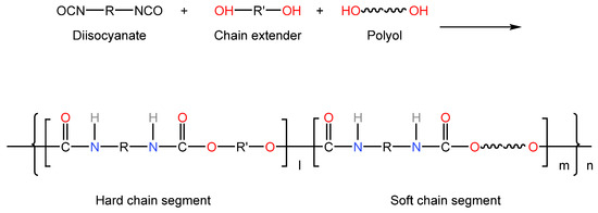 The oligomer diol commonly used in TPU is polyester type. The prepared TPU has high strength, excellent wear resistance, solvent resistance and mold resistance, and hydrolysis resistance is moderate. TPU synthesized from poly(tetramethylene) glycol (PTMG) has excellent elasticity and low-temperature resistance [7]; polybutadiene polyol TPU has high water resistance and electrical insulation. TPU synthesized from polycarbonate polyols has high strength, excellent hydrolysis resistance and abrasion resistance, but the cost is high [8]. Poly(ε-caprolactone) diol TPU has good comprehensive performance, but its cost restricts applications [9]. These oligomeric diols can be used as a soft segment of the polymer alone or can be used to synthesize polyurethane, The reaction to form urethane group is shown in Figure 2, thus realizing many properties and satisfying extensive application fields. In PTMG mixed with PPG polyols, on the one hand, the side groups of the soft segment are increased due to the introduction of PPG, increasing the hydrogen donor group in the hard segment and the steric hindrance of polyether oxygen atoms in the soft segment, thereby reducing the formation of hydrogen bonds between hard and soft segments, reducing viscosity while promoting microphase separation, improving the low-temperature resistance of TPU. On the other hand, the existence of methyl branches also hinders the complete separation of soft and hard segments, reduces the orderly arrangement between elastomers and is detrimental to some properties of TPU. Therefore, in the synthesis of TPU, the type and proportion of polyols should be determined according to the specific application environment and performance requirements to achieve the best mechanical properties and processing operation.