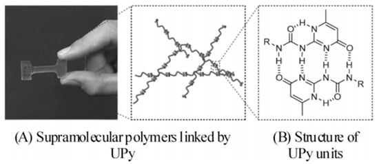 In 1997, Meijer et al. [39] developed an important class of AADD assembly units with quadruple hydrogen bond interactions: 2-ureido-4[1H]-pyrimidinone derivatives (UPy), and grafted them with UPy units at the end of ethylene-butene copolymer (PEB) macromolecular chains to prepare PEB-UPy supramolecular polymers [40] (as shown in Figure 3). Compared with ungrafted PEB, PEB-UPy has higher mechanical strength and exhibits typical thermoplastic properties at room temperature.