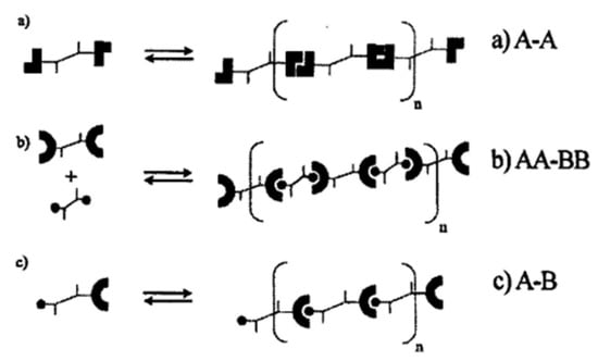 The preparation of thermo-reversible supramolecular polymers with a network structure by hydrogen bond interaction between small molecules (or oligomers) has been a hot topic in the field of supramolecular chemistry in recent years [41]. Theoretically, when the two ends of the small molecule have hydrogen bond synthons that can interact with each other under certain conditions, “long-chain polymers” can be formed due to the interconnection of hydrogen bonds. When the average number of hydrogen bond functional groups of the small molecule is greater than two, it may also form a supramolecular structure with a network structure connected by hydrogen bonds. The process of forming “macromolecules” (supramolecule) through hydrogen bond interaction between molecules is apparently very similar to the condensation polymerization of small molecule monomers, as shown in Figure 6.