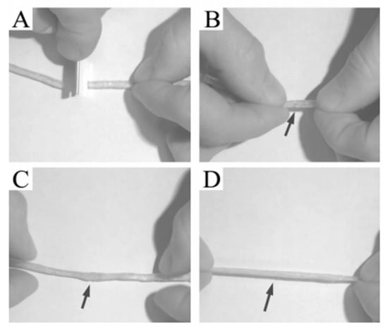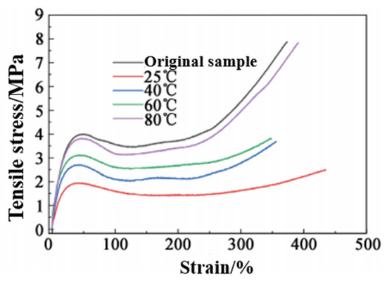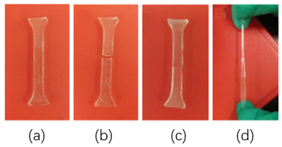 The elastomer was cut off and placed in an oven at 80 °C for 24 h. When it was taken out and a tensile test was performed, it was found that the sample was not broken even if the necking phenomenon occurred. This process is shown in Figure 9.