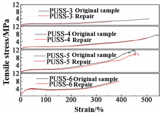 Gao et al. [54] further prepared polyurethane elastomers based on polysulfides. After the tensile strength reached 5.8 MPa at 75 °C for 24 h and 100 °C for 4 h, the self-healing efficiency reached 90.8% and 93.1%, respectively. Moreover, it was found that the flexibility of polysulfide segment molecules and low crosslinking degree were beneficial to enhance the repairability of the sealant network. It can be seen that the repair efficiency and strength of disulfide self-healing materials cannot be simultaneously improved at present.