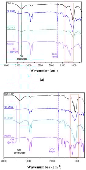 In Figure 2, ATR-FTIR spectra of the examined CNCs are reported, where differences in FTIR spectra of CNCs functionalized with NX9201 and NX9203 polyols are displayed in Figure 2a,b, respectively.