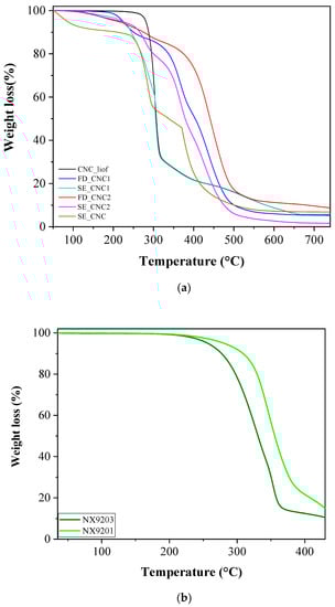 On the other hand, FD_CNC1 and FD_CNC2 (Figure 3a, blue and red curves) exibited a first step associated to the solvent and polyols degradation (~14 wt%) in the range 195–350 °C for the FD_CNC1 and 150–400 °C for the FD_CNC2, respectively, presenting similar thermodegradative behavior of NX9203 and NX9201 polyols, displayed in Figure 3b.