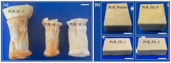 PUR_SE_0, PUR_SE_1 and PUR_SE_2, produced through solvent exchange procedure are displayed in Figure 4. As observed, the addition of such fillers produced collapsed and shrinked foams (Figure 4a).
