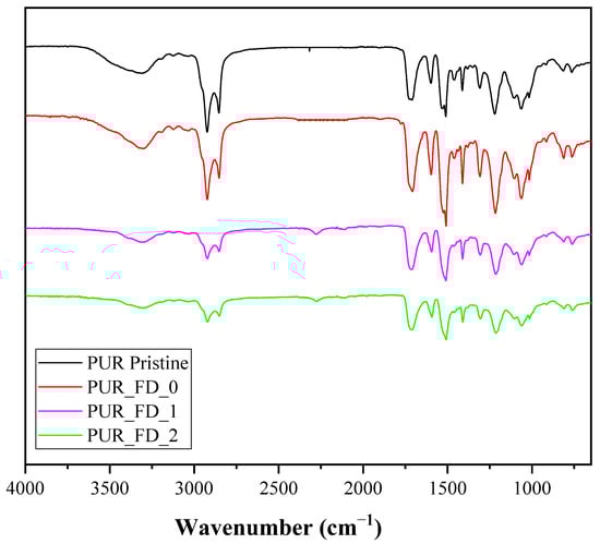 Clearly, PUR_FD_1 showed higher mechanical properties with respect to the other foams, by presenting higher modulus and stress at 10% of deformation (Table 4), corresponding to the highest stress–strain curve among the present set of experiments. This sample had the same elastomeric behavior of PUR_FD_2, although this later revealed lower modulus and stress values. On the contrary, PUR-Pristine and PUR_FD_0, revealed behavior closer to an elastic-plastic one [64].