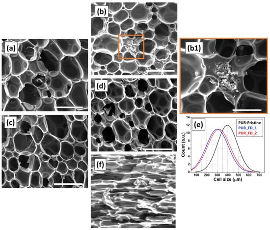 Morphological analysis of composite PUR foams was carried out using SEM microscopy (SEM, FEI ESEM Quanta 200, operating at 30 kV using different magnifications). Foams were cut in the growth direction and coated with gold using a sputter coater (model SC500, emScope-now Quorum Technologies Ltd., Laughton, UK) before imaging. Cell size distribution and average cell size were evaluated using a commercial software for image analysis (Image J). For each tested foam, 50 entire cells were chosen to assure a statistically representative determination.