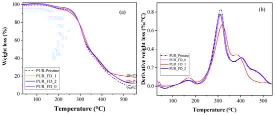 For un-functionalized FD_CNCs, three degradation stages (Figure 3a, black curves) were recorded: one main degradation step occurring around 300 °C (with a weight loss of 70 wt%), due to the water evaporation and rearrangement of the CNCs, a second step (with a mass loss of around 10%) in the range 310–400 °C due to the degradation of CNCs linked to the sulphate groups (which were generated during the hydrolysis with sulphuric acid during the CNCs extraction process [58]) and a third peak of degradation due to the cross-bridging and aromatic cyclization of charred residue at 700 °C of around 8 wt%, respectively [58].