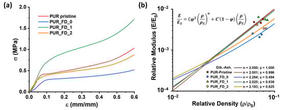 The obtained results were also studied by means of a modified Gibson–Ashby model. Starting from the well known equation [54] (Equation (1)), applied to closed-cells foams, when compression tests were performed and a linear elasticity behavior can be identified.