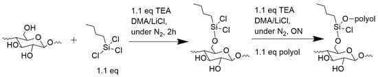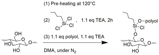 Functionalization of FD-CNCs was conducted in two steps: first dissolution in TEA and then silanization. In details, 1.1 equivalent of TEA and n-butyl-trichlorosilane, respectively, were added and stirred for 2 h and 70 °C. Subsequently, 1 equivalent of bio-based polyol (properly solubilized in DMA under nitrogen flux) was added to the aforementioned colloidal solution for 3 h at 100 °C.
