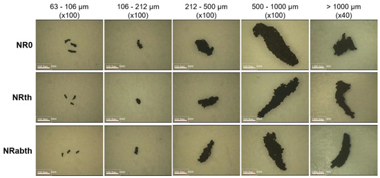 Magnified images of the wear particles. The magnification of wear particles larger than 1000 μm was 40 (the scale bar: 1000 μm), and the others were 100 (the scale bar: 550 μm).