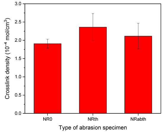 Friction and heat generated by the wear process age the tire, which affects the properties of the tire tread [24]. Thermally aged tread compounds can generate additional network chains and may increase the crosslink density [25]. These changes are directly related to the lifespan and abrasion behavior of the tire. By thermal aging of a rubber vulcanizate used for tire tread, a real situation for the thermally aged tire can be reflected.