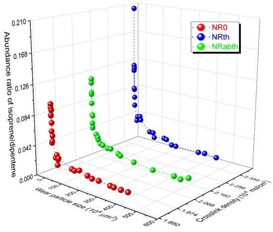 In order to find a good relationship between the isoprene/dipentene ratio and the wear particle size, the isoprene/dipentene ratio was plotted as a function of logarithmic particle size, as shown in Figure 5. Only one datum of the 63–106 μm particles of the NRth sample was excluded because it showed an abnormally large value of the isoprene/dipentene ratio. At the wear particle size of 1.0 × 105 μm2 (logarithmic scale = 5.0), the variations were changed at the wear particle size of 1.0 ×105 μm2; the increasing rates at the wear particle size smaller than 1.0 × 105 μm2 were much greater than those at the particle size larger than 1.0 × 105 μm2. For the wear particles smaller than 1.0 × 105 μm2, the increasing rates of the isoprene/dipentene ratios were 6.27 × 10−2, 6.49 × 10−2, and 8.41 × 10−2 per 10 μm2 of the wear particle size for the NR0, NRth, and NRabth samples, respectively. For the wear particles larger than 1.0 × 105 μm2, the increasing rates were 1.14 × 10−2, 2.46 × 10−2, and 1.88 × 10−2 per 10 μm2, respectively. The wear particle size of 1.0 × 105 μm2 roughly corresponds to the sieve size of 212 μm. For the wear particles larger than 2.0 × 106 μm2 (logarithmic scale = 6.3), the isoprene/dipentene ratios were almost the same. Variations of the isoprene/dipentene ratios of the wear particles smaller than 1.0 × 105 μm2 with the crosslink density did not show a specific trend, but for the wear particles larger than 1.0 × 105 μm2 the increasing rate tended to increase as the crosslink density increased.