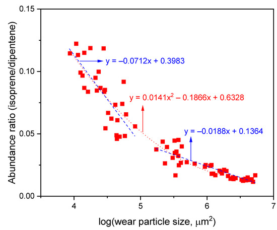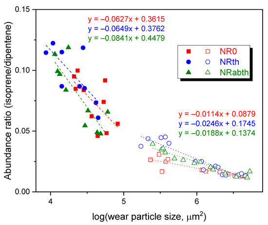 Variations of the isoprene/dipentene ratios of the wear particles with the logarithmic wear particle size. The wear particle size is the multiplication of the major and minor axes. All the wear particles produced from the NR0, NRth, and NRabth samples were gathered.