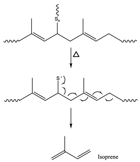 Pyrolysis mechanism for the formation of isoprene from NR by dissociation of sulfur crosslink.